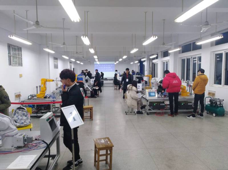 此次比赛内容为面向智能制造领域,利用工业机器人轴承自动装配单元,在1小时比赛时间内,通过机器人示教编程和自动运行,参赛队员和机器人协作完成轴承装配动作。经过4小时的紧张比赛,最终9支队伍获得一、二等奖并成功晋级首届安徽省老员工工业机器人应用大赛决赛,8支队伍荣获三等奖。