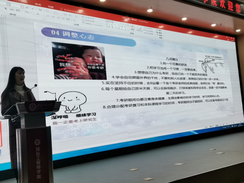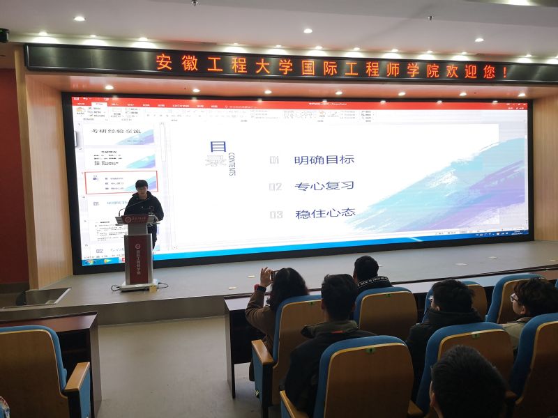 交流会分为学业现状通报、考研方向解读、考研经验分享、师生互动交流四个环节。首先,李文江副书记发言,她希望同学们加强基础知识学习,打牢基本功,围绕考研和就业,明确目标并为之不懈努力,“努力到无能为力,拼搏到感动自己”。