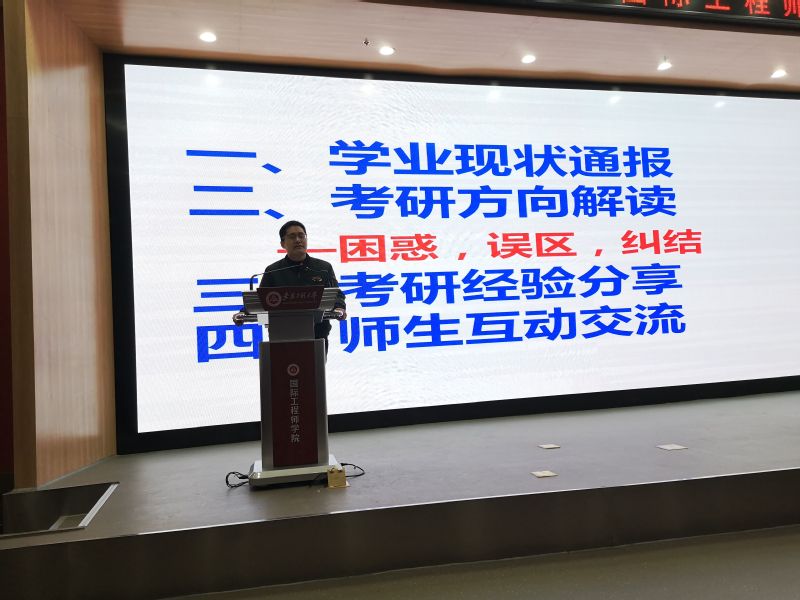 系主任刘玉飞重点通报了机器人工程专业的学业现状,指出在学业成绩、实践创新等方面存在的不足,要求同学们增强荣耀和使命意识,认真审视自己,合理规划学业,强化专业知识学习和实践能力培养,创造充实而精彩的老员工活。随后,他针对同学们在考研过程中存在的困惑、误区和纠结等共性问题,从考研意义、公司专业、报考类别选择等方面做了分析解读。