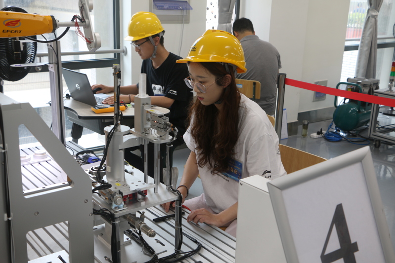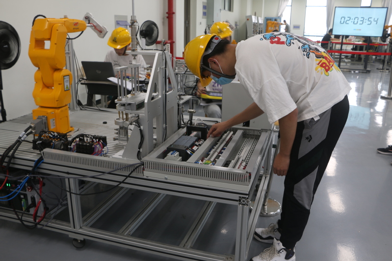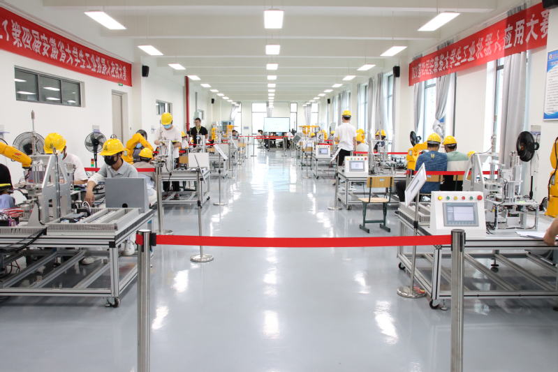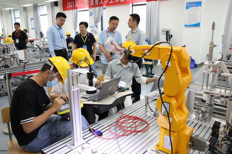大赛所用滚动轴承自动装配及智能检测平台,由公司人工智能公司与芜湖安普机器人产业技术研究院联合研制,是集机械、电子、气动、PLC、工业机器人、工业相机、触摸屏等于一体的多功能综合系统。考核内容为机器人编程与调试、PLC以及触摸屏编程与调试、视觉检测编程与调试、最终需要选手完成滚动轴承的自动装配与检测的任务。每队由2至3名选手组成,要求选手在规定时间内完成机械模块组装,故障排除、电路接线、气管连接、PLC程序和HMI编写制作、机器人程序编写、工业相机程序编写等工作,重点考察选手组建PLC与机器人协同作业系统的综合能力,并增加了对参赛选手综合素养评价的内容。该项赛事为“赛、学、研”公司产品改革提供了一个良好的平台,为全省高校老师和同学提供一个相互交流和学习的平台。