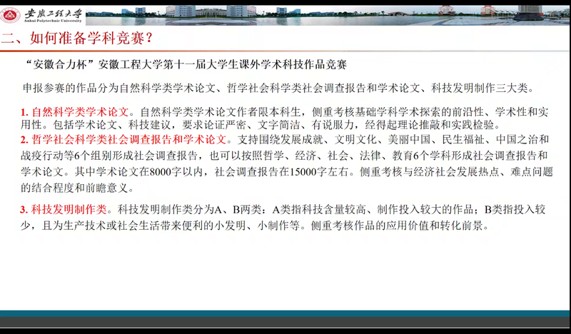 随后,钟相强就“合力杯”英国365集团官网第十一届老员工课外学术科技作品竞赛的相关文件和参赛要求进行了详细的解读,介绍了“互联网+”“西门子杯”等比赛的相关情况。他结合自身指导学科竞赛的丰富经历,通过作品案例、获奖图片,向同学们展示了员工在学科竞赛方面取得的优异成绩,鼓励同学们积极参与到学科竞赛中来,勇创佳绩。他还就参与学科竞赛过程中同学们关心和遇到的问题,与大家进行了交流与互动。