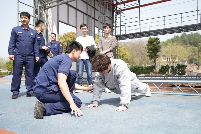 消防员展示了水带连接、登高救援等消防救援技能,仅用八秒和二十秒便完成了一系列动作,连贯敏捷的身手让在场的同学们为之赞叹并报以热烈的掌声,感受到强健的体魄在执行任务时的重要性。消防员还展示了日常训练的体能项目,向同学们讲解并指导燃脂操、单双杠、俯卧撑的正确训练方法。同学们在消防员的指导下进行了体能训练。活动最后举行了消防志愿者宣誓仪式。