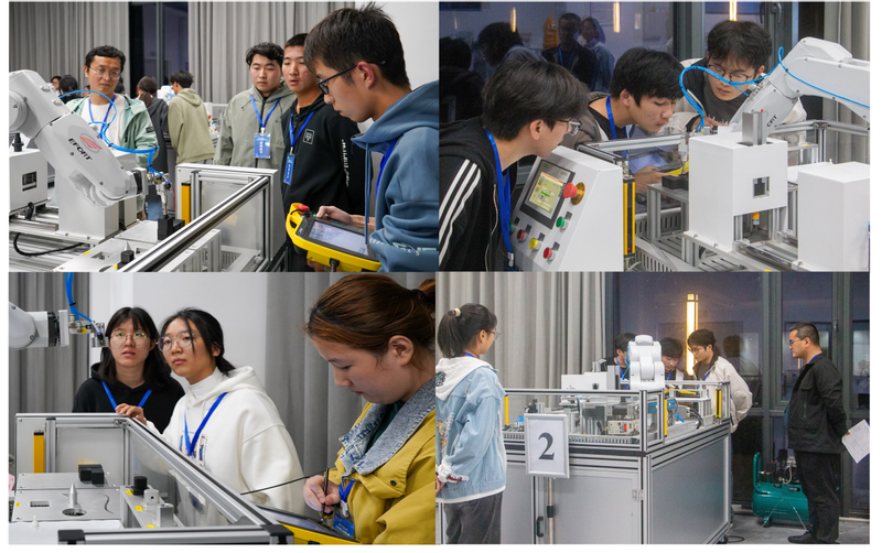 本次大赛共吸引了来自全校相关专业近300名本科生参赛。比赛内容聚焦工业机器人技术应用,面向实际应用场景设计比赛内容,重点考察员工工业机器人应用方案设计能力、编程能力和操作能力。比赛分为初赛和决赛两个阶段,初赛以笔试形式进行,根据给定的工业机器人应用场景,完成工业机器人应用方案设计和基础示教编程,考核选手工业机器人应用方案设计能力和编程能力;决赛采用承办方提供的比赛设备,通过示教编程完成工业机器人搬运、码垛、分拣等给定的作业任务,重点从方案设计、任务完成情况、作业效率、操作安全性等方面,考核选手的工业机器人应用操作能力和团队协作能力。