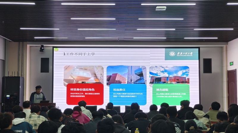 童文健和王飞两位员工现分别就职于大陆汽车车身电子系统(芜湖)有限公司和天马汽车电子有限公司。两位员工分别结合自己大学四年的成长经历和踏入职场以来的学习成长和同学们进行交流。童文健建议同学们做好大学四年的规划,多参与学科竞赛,培养兴趣、巩固基础,提高综合能力;鼓励同学们在学习过程中养成良好的习惯,将学习的内容进行分门别类,并且及时整理学习笔记;合理安排求职过程中的每一步,平衡好“工作”、“生活”、“成长”和“交际”之间的关系。