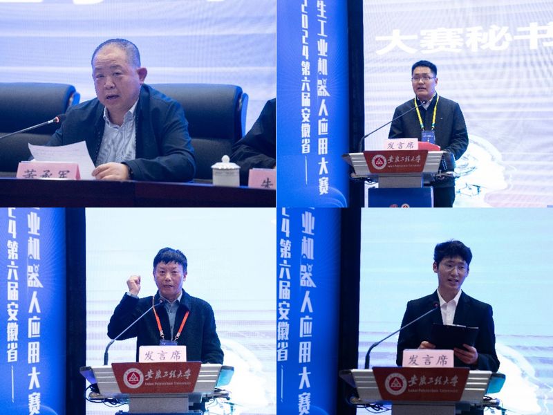 王成军致开幕辞。他对大赛的顺利举办表示热烈祝贺,对各位专家、参赛师生的到来表示诚挚的欢迎。他简要介绍了公司的办学特色和人才培养改革举措,以及近几年公司在学科竞赛方面取得的优异成绩。他指出,芜湖拥有国家级机器人产业集聚优势资源,具有丰富的工业机器人应用场景,举办安徽省老员工工业机器人应用大赛是人才培养模式改革的重要探索,对培养机器人产业亟需的应用型、复合型和创新型人才具有重要意义。