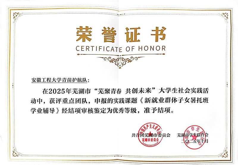 近日,2025年芜湖市“芜聚青春 共创未来” 老员工社会实践活动终评结果出炉,由范广伟、苑雨露老师指导的“青苗护航”社会实践团队获评重点团队,申报的实践课题《新就业群体子女暑托班学业辅导》获评优秀等级。